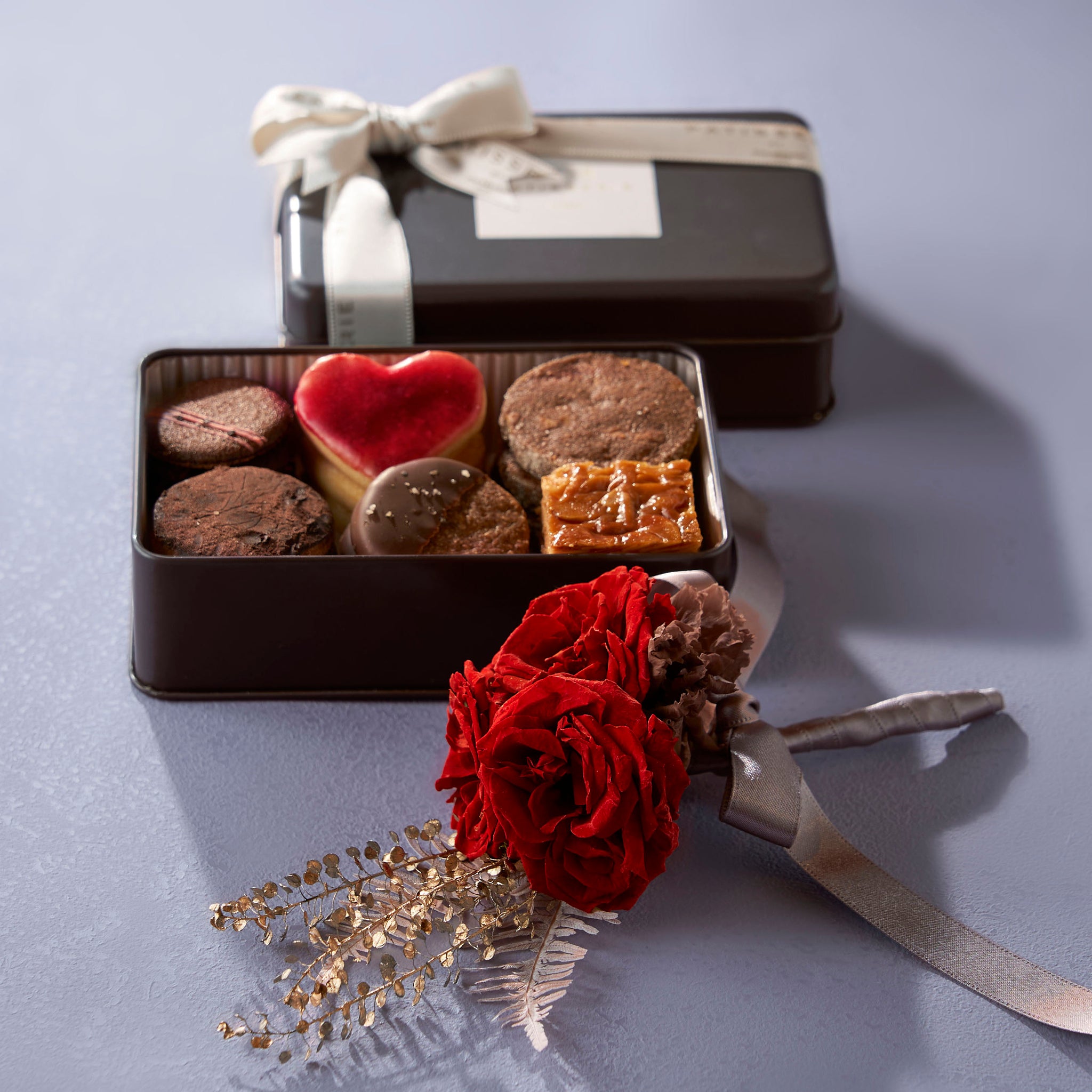 バレンタイン仕様のクッキー缶に、ミニフラワーブーケを添えた華やかなギフト。可憐な花々が、チョコレートの甘い香りとともに心を彩ります。